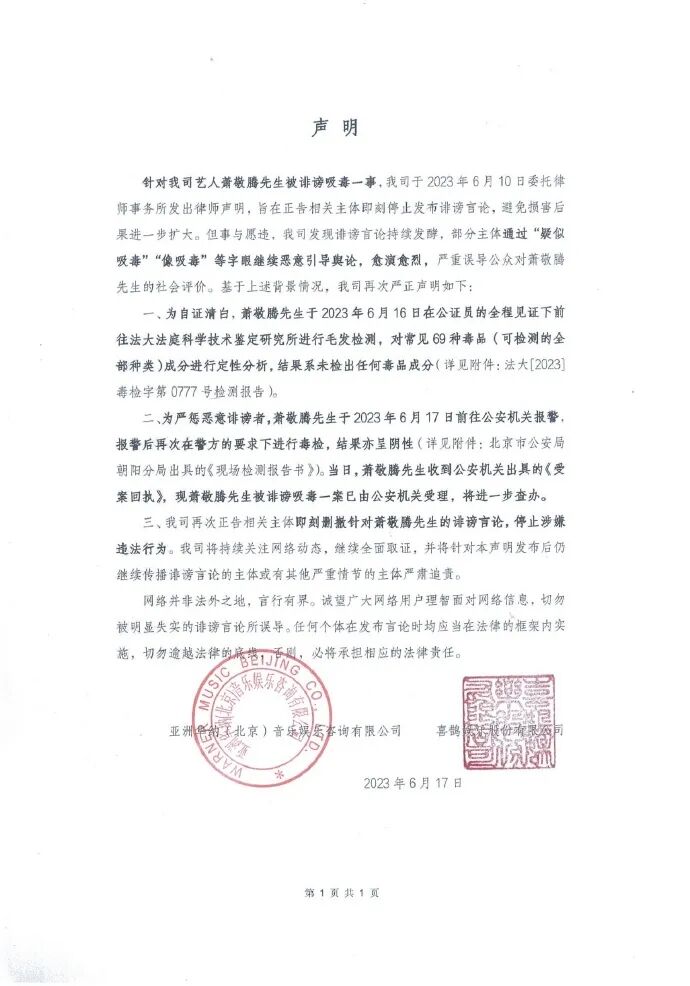 我司艺人萧敬腾 先生坚决遵守国家法律法规,严于律己。网络并非法外之地,我司对网络诽谤造谣零容忍!诽谤事件发生后,我司及时联系权威检测机构进行毛发检测,结果显示未检出任何毒品成分,并在与律师团队商议后,决定做报警处理,希望这场网络诽谤就此终止,也希望大家可以共同维护网络环境健康良好发展,坚决抵制造谣诽谤行为!