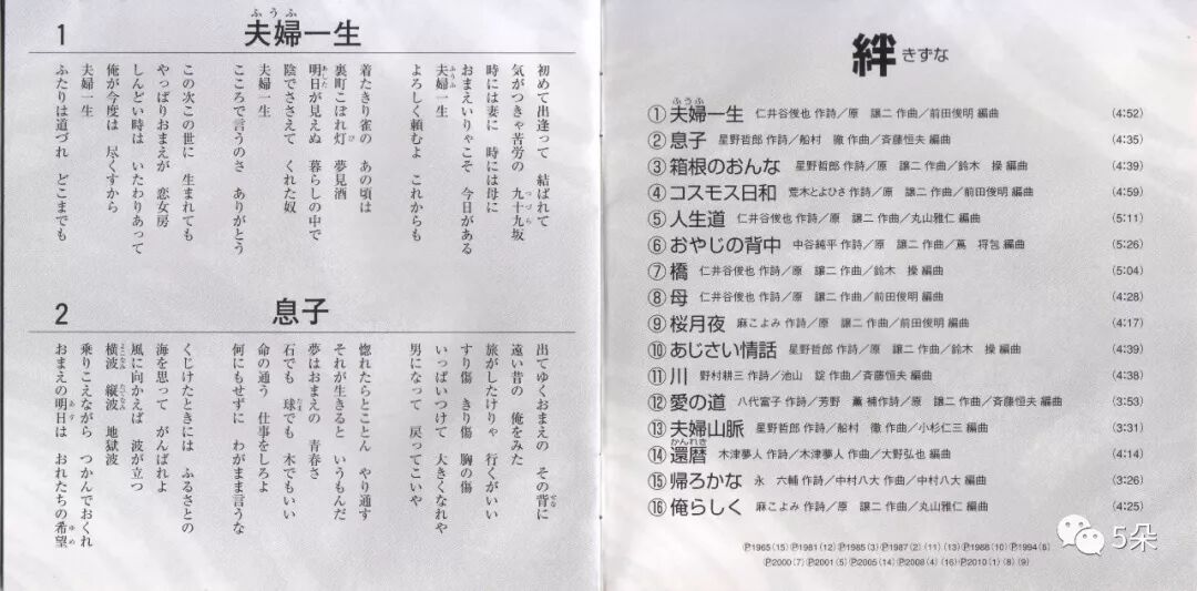 夫婦愛を歌った「夫婦一生」と「桜月夜」、ラジオ『深夜便のうた』関連の「母」という新曲を中心に据えた御大の人柄がにじみ出たアルバムで、さまざまな絆、縁をテーマにしている。収録曲の中には60年代半ばにテレビから生まれた懐かしい「帰ろかな」も含まれていて、あらためて故郷とのつながりの大切さも考えてしまう。