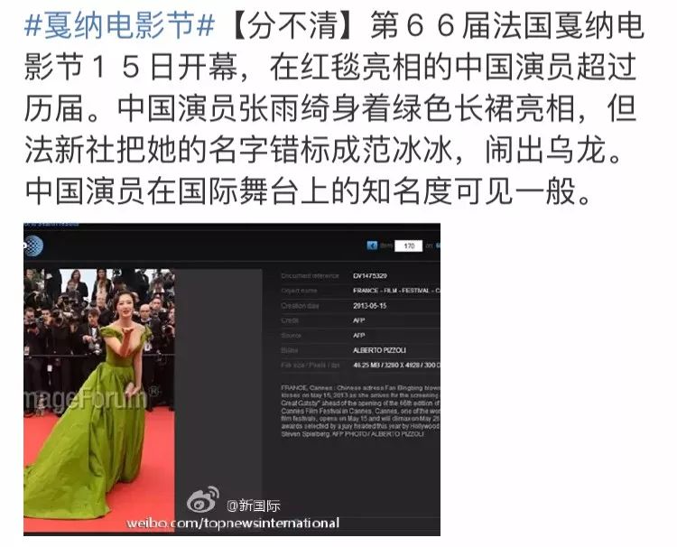 法新社则把张雨绮报道成了范冰冰。
