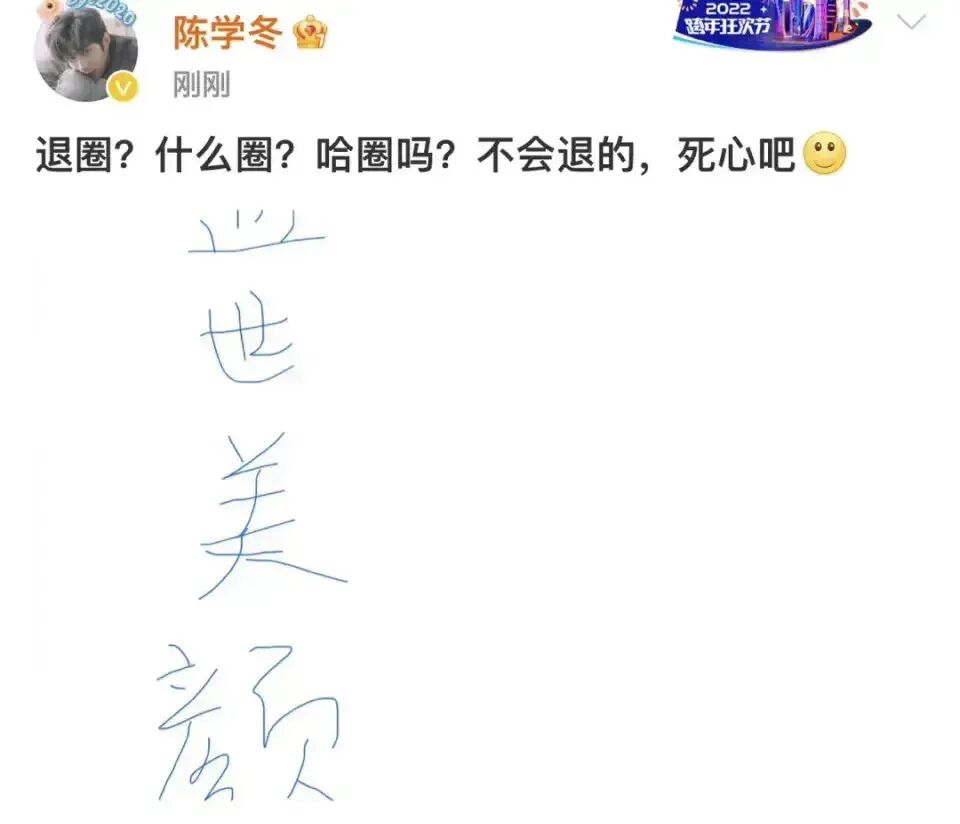 对此,陈学冬晒出一张手写“盛世美颜”的图片否认退圈:“退圈?什么圈?哈圈吗?不会退的,死心吧。 ”