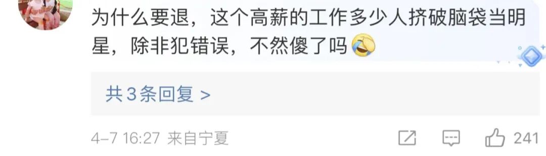 不过想想也正常,为什么要退,这个高薪的工作多少人挤破脑袋当明星,除非犯错误被迫退圈,否则谁会甘心放弃一边疯狂捞金一边享受追捧的绝好职业。
