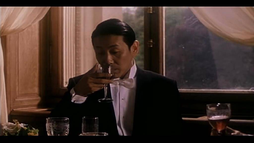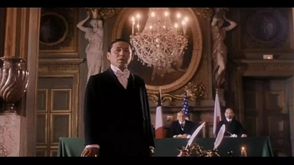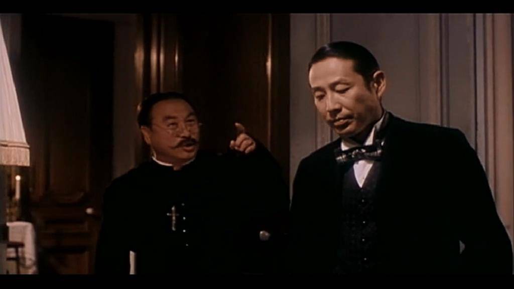 且看片中演来:顾维钧和美国代表威廉士寒暄握手后落座,威廉士委婉道明此餐之意,日本代表牧野从侧堂步出来到桌前,向顾维钧面带微笑鞠躬为礼,浑不似二人两国刚在和会上有过一场激烈阵仗。这里的第一个细节是顾维钧稳坐泰山,连点头示意都不屑得敷衍一个。这个细节我觉得很赞。顾维钧是英美达人外交英杰,对西方社会的交际礼节应该也是浸润有加的,他这里竟如刘邦踞见宾客毫不为礼,看似有悖人物合理举止,其实是形为傲慢,实为不屑——对强盗,没有什么需要客气敷衍的。