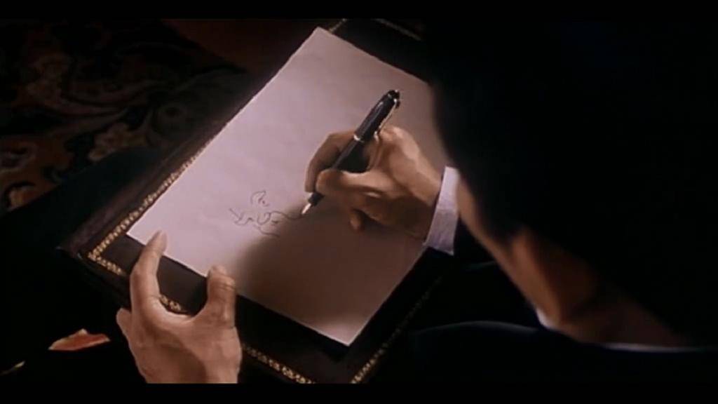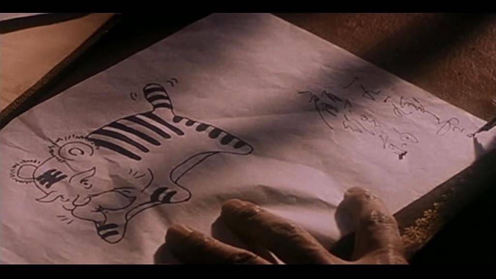从镜头里可以看出,画这只漫画布老虎、落款签名“顾维钧”,都是演员陈道明亲力亲为,并未如有的影视剧中演员弹琴先一个镜头给上半身下一个镜头给手指拨弦特写——替身拼凑。陈道明能书善画,且有表演创作习惯为所演角色勾画肖像,画此一画自非难事。