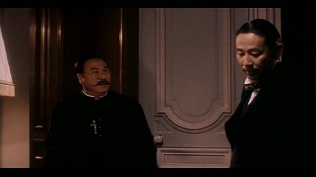 回到顾维钧。陆总长离开巴黎后,出席和会第二次也是最后一次会议——签字仪式的,是顾维钧和王正廷。细心的观众须记得,前边戏出席和会初次会议,也是顾、王二位,陆总长也以身体不适为由推故没有出席(这也是一个前后呼应~)。小跑个题:扮演南方政府代表王正廷的是李建义,熟悉94版剧集《三国演义》的观众必识得此公——他是该剧主力配音演员,配过剧中大大小小角色不下七八个。有意思的是,本片中的陆总长修宗迪和王正廷李建义,在同一部剧《三国演义》中演了同一人物——李建义演陈宫,修宗迪也演了陈宫(二人在不同集中分别演,老三国就有这点问题,换演员太多,赵云也是三个演员杨凡张山侯永生……);更有意思的是,修宗迪演的陈宫,还是另一个陈宫李建义配的音!