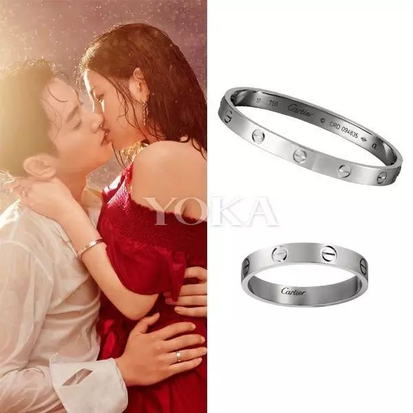 小两口对卡地亚的爱早已根深蒂固,此前在拍摄大片写真时就戴了,这张湿身拥吻照很早就被虐过了,陈妍希佩戴了LOVE系列18K白金手镯,陈晓佩戴了LOVE系列18K白金戒指。
