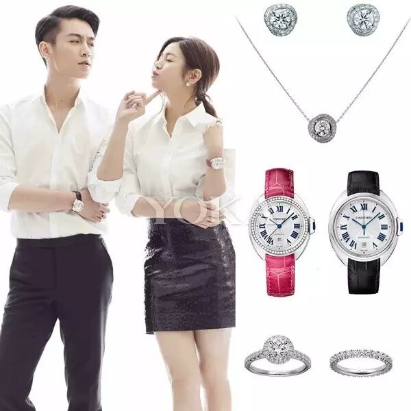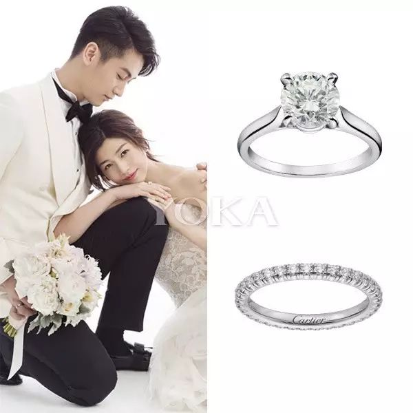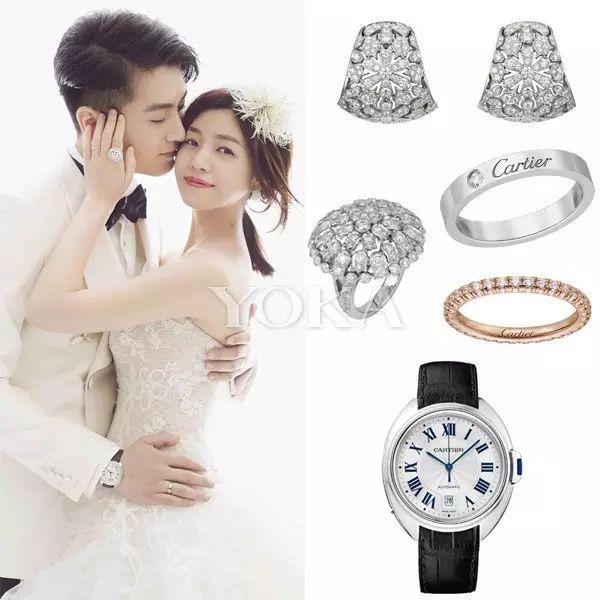 两人的全套珠宝毫不例外都选择了卡地亚,陈妍希佩戴了Cartier高级珠宝系列耳环和戒指以及经典系列结婚对戒,陈晓则佩戴了Cartier镌刻“Cartier”系列结婚对戒和Cle De Cartier系列腕表。