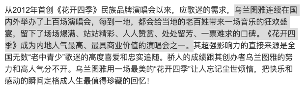 在通稿中说,乌兰图雅在国内外举办了上百场演唱会: