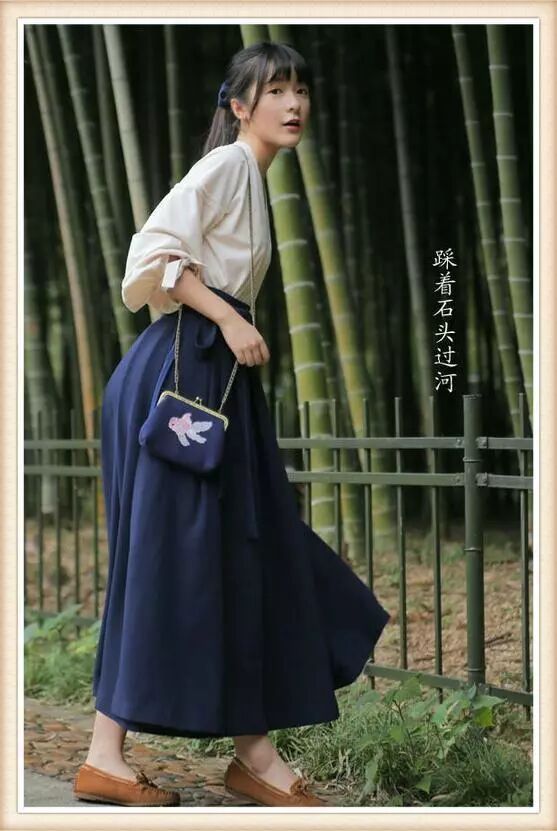 米白色的上衣充满原宿风的感觉,配上深蓝色的高腰长裙充满少女感,搭配深蓝色的绣花挎包十分撩人。搭配棕色的平底鞋更显真挚哦。