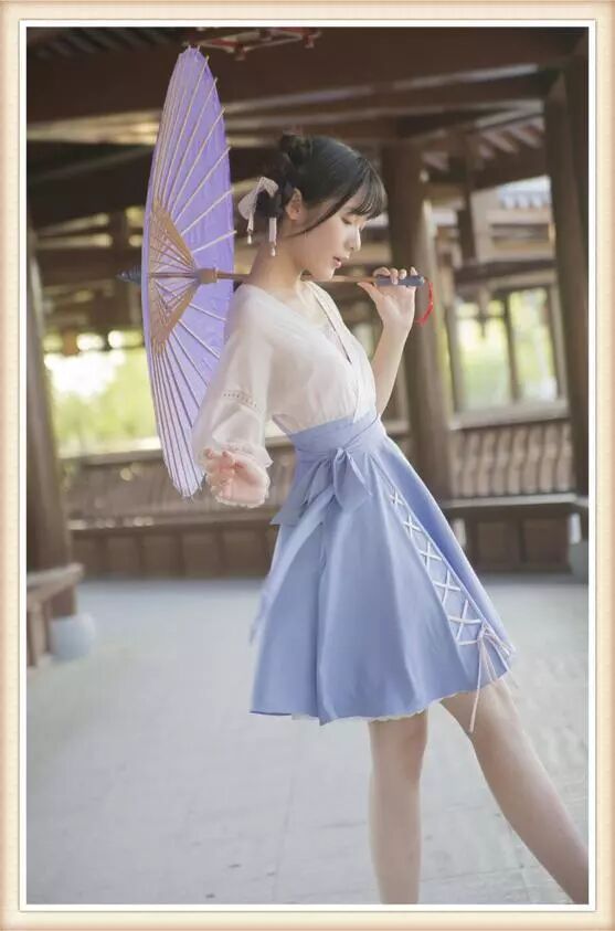 米白色的上衣开衫的穿搭十分的妙曼,喇叭袖摆的设计很可爱呢,搭配蓝色的高腰短裙很是俏皮,不得不说充满中国风元素的穿搭很有范儿。