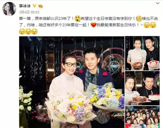 娱乐圈中最近事情比较多,除了妲己吸毒的事之外,还有让观众喜爱的饰演了一辈子反派角色的著名表演艺术家葛存壮离开了我们,再加上前不久小李子终于将小金人捧回了家,以及那个台湾艺人Selina突然在网上宣布与老公离婚,这些都让人感觉人生苦短,如果再不好好地活一回,似乎都有点亏的慌。也许是这些事凑在了一起让我们每个人都有很多感慨,其实对于娱乐圈的那些明星们也是一样,这不嘛,一向喜欢刷微博的李冰冰如今再次搞怪起来,昨天她在微博上给好友任泉祝寿,写道: