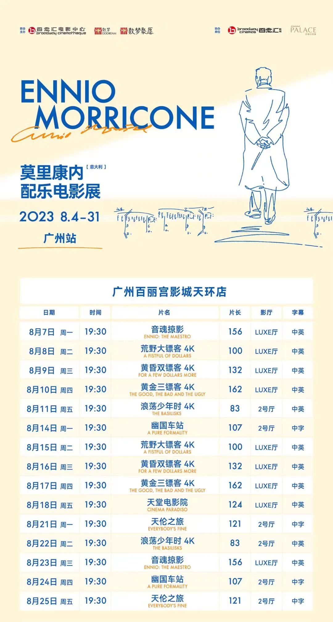 8月4日-8月31日,广州、佛山、深圳三地将举办意大利大师莫里康内配乐电影展。