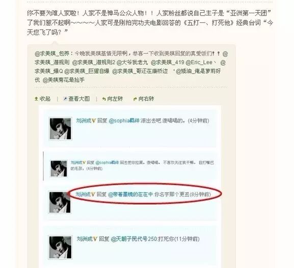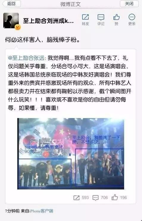 2013年6月28日中韩歌会上,韩饭截图称至上励合致谢时未如韩艺人90度鞠躬,刘洲成微博直讽其为脑残棒子粉,引韩饭众怒。