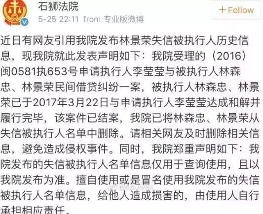 林苗还回击自己的父亲不是失信人员,纠纷问题已经达到了和解,林景荣已经从失信名单中删除。