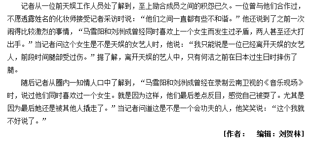 2011年6月,马雪阳和刘洲成录制《音乐现场》时,刘洲成突然说了一个藏了两年的大料。刘洲成说,他和马雪阳同时喜欢过一个女生,还因为这样,他们最后差点反目。而这个女生,被扒出是何洁。