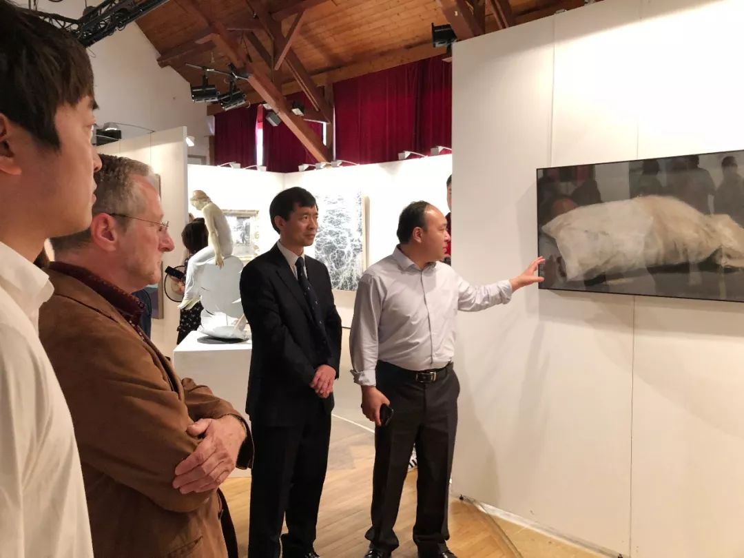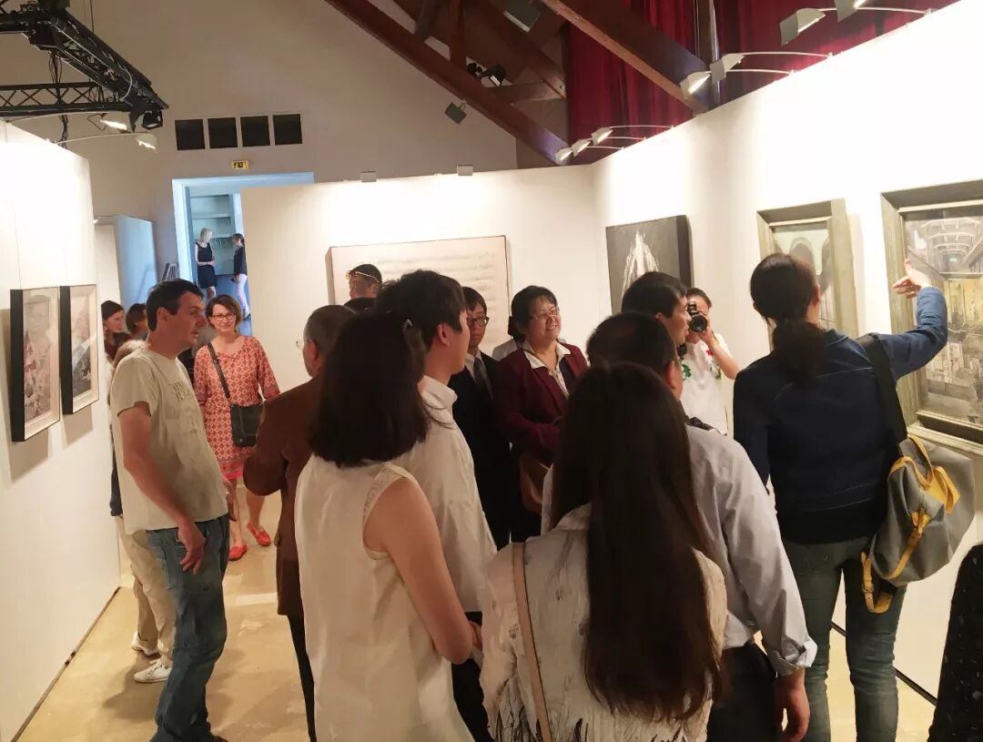 (从左至右)艺术家艾妮莎、艺术家程广峰、策展人王麟、米勒博物馆馆长娅玛女士,法国巴比松市长杜斯·菲利普、策展人姬忠鹏、艺术家哈妮斯、艺术家申树斌、艺术家夏俭宁