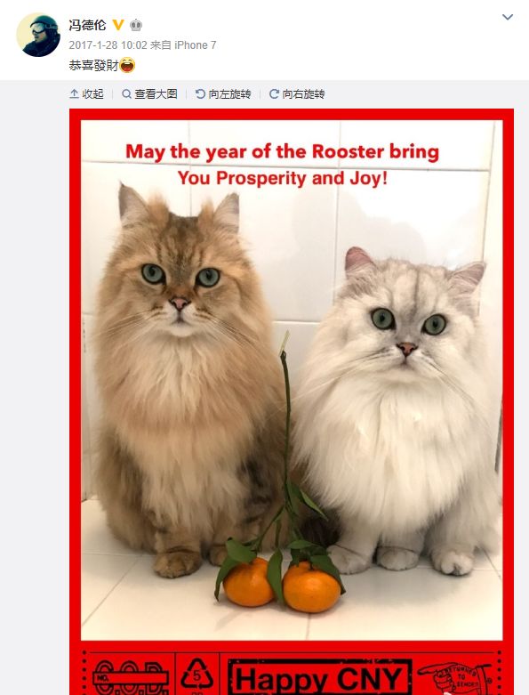过年时不同框,而是发了两人的猫咪合照:恭喜发财。