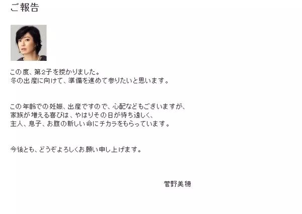 菅野美穗通过事务所官网正式宣布怀孕,特别提到「在这个年纪怀孕、生产,一定有很多人担心,但是又增加一个家人的喜悦,还要再等一段漫长的时间,我的丈夫、儿子,对这腹中的新生命注入很多力量。」长子到八月份就三岁了,她还要照顾孩子,加上怀二宝身体有些吃不消,因此正逐渐减少工作。