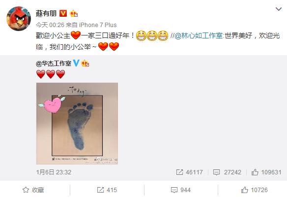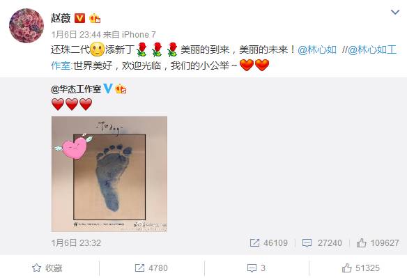 林心如工作室转发霍建华工作室微博时,宣布是一名女孩儿。