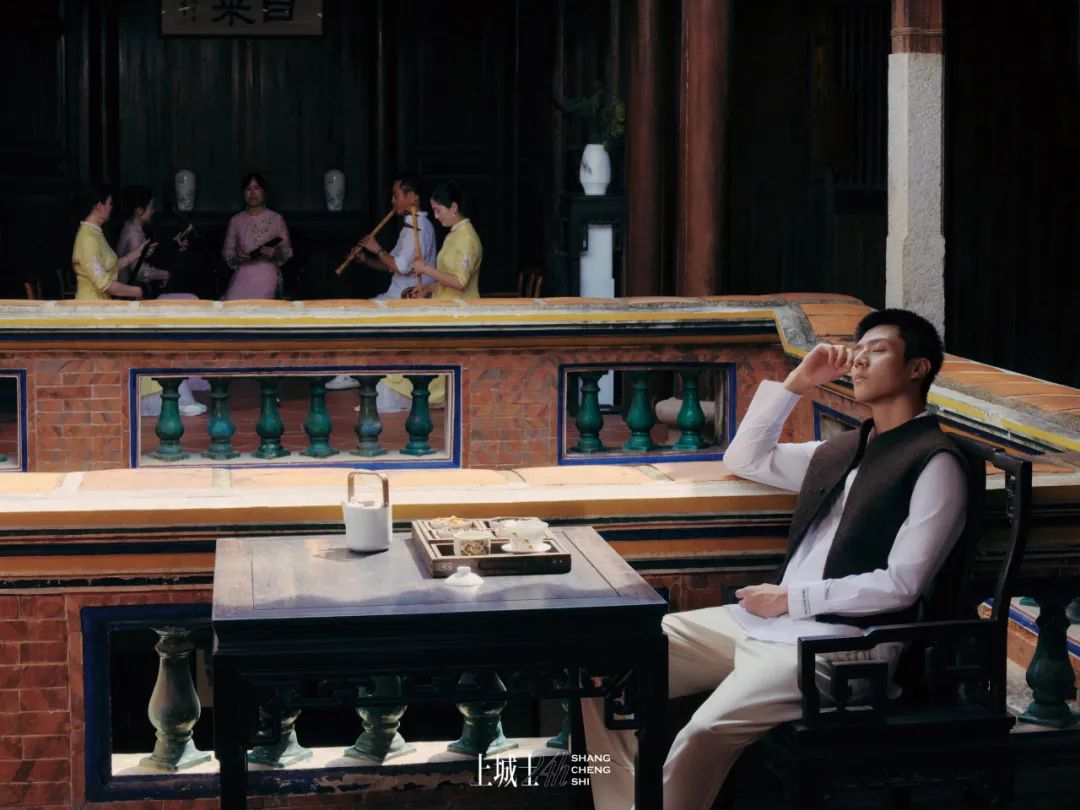 排练间隙,余庆楼的工作人员上前相迎,引着他穿过前厅,转而来到厅后的木质旋转楼梯,慢悠悠地上了二楼。楼上为“二进五间张”的闽南传统木结构,中央厅堂被用作表演戏台,与茶座隔栏相望。陈靖可寻了处位子坐下,店家随即烧水沏茶,当白瓷盖碗内的叶片随着热水翻腾,南音表演便正式开场了。