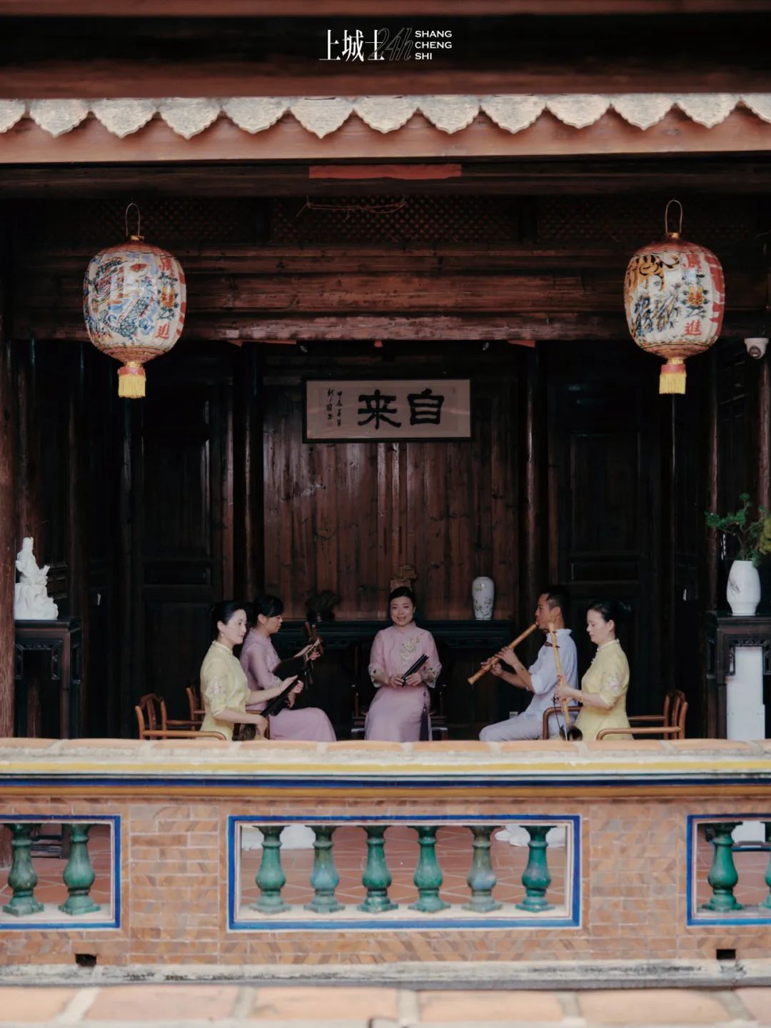我们前往的第一站,是始建于民国时期的余庆楼。余庆楼外观兼具中西风格,同时保有闽南地区的建筑特色。一进门,前厅的天井框住四方蓝天,将有限的日光倾注在一汪荷花池上。当日,由泉州几位技艺精湛的南音老师组成的南音乐团正在正厅排练曲目。袅袅琴音透过陈旧的、吱吱呀呀的雕花木门向外传递,让陈靖可循着曲调推门踏入,驻足倾听。