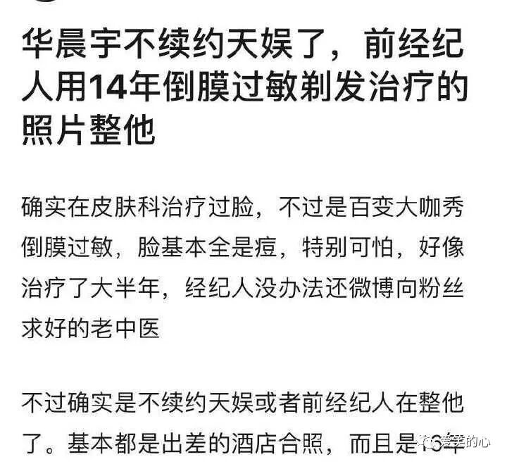 有人相信,有人不相信。看到这个消息后,华晨宇粉丝出来澄清,说这是华晨宇2014年参加《百变大咖秀》的时候,因为模仿刘欢老师,脸上蒙了一层膜,导致面部过敏差点毁容.有网友表示,华晨宇与现公司的娱乐合同到期,而前经纪人开始来这波操作,为的就是让华晨宇招黑.