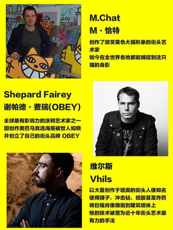 这一次的涂鸦展,绘画师可都来头不小~火遍全世界的微笑大猫创作家、知名街头品牌OBEY的创立者还有超有自己个性的维尔斯,他们的画作都会出现在展览里!想象一下,现场是个街头聚集地没错了!快穿上你所有的潮牌来这里一起成为街头达人~