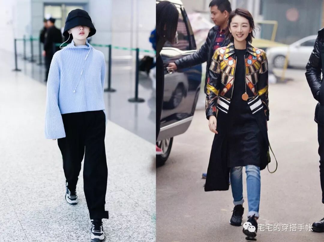 而短外套加上长度一直到脚的内搭,从外套的底端一直到脚面看起来都是腿,二者相比较右图中的她显高不只一点点。