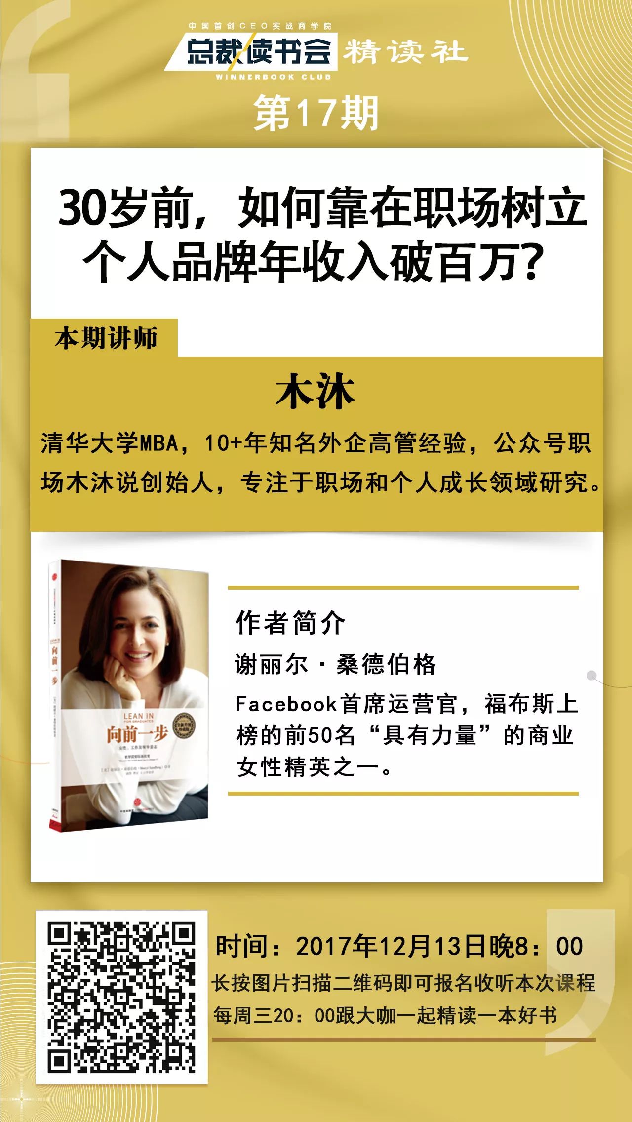 本周三,12月13日,总裁读书会联合职场木沐说倾情解读《向前一步》,为你解密“30岁前,如何靠在职场树立个人品牌年收入破百万?”,激励女性勇敢地追求自己的目标,实现事业与家庭生活的完美平衡!