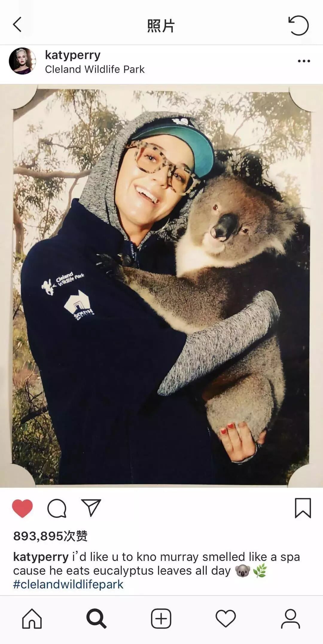 图片中,Katy Perry 来到了位于南澳大利亚州,阿德莱德山上的克莱兰德野生动物园(Cleland Wildlife Park),怀抱萌萌的考拉“默里(Murray)”,并评论道:“我希望大家知道,默里(Murray)闻起来像做了 Spa,因为它吃了一整天的桉树叶”,实在是很软萌又很有爱呀~
