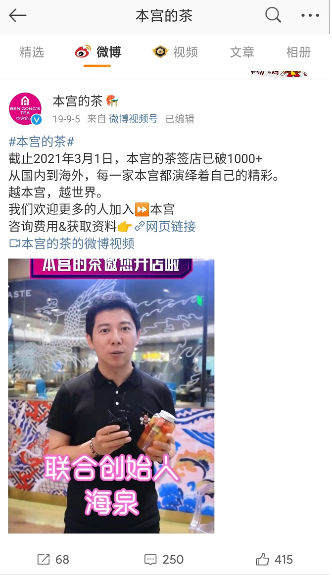 记者注意到,“本宫的茶”公众号明确标注“胡海泉联合创始茶饮品牌”,胡海泉为该品牌的联合创始人。