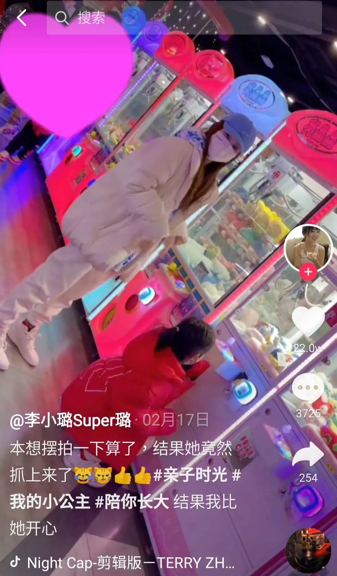 ▲在一条抓娃娃的抖音视频里,她写的是:本想摆拍一下的,结果她真的抓上来了,但画面是,当甜馨抓到娃娃后,李小璐马上面对镜头