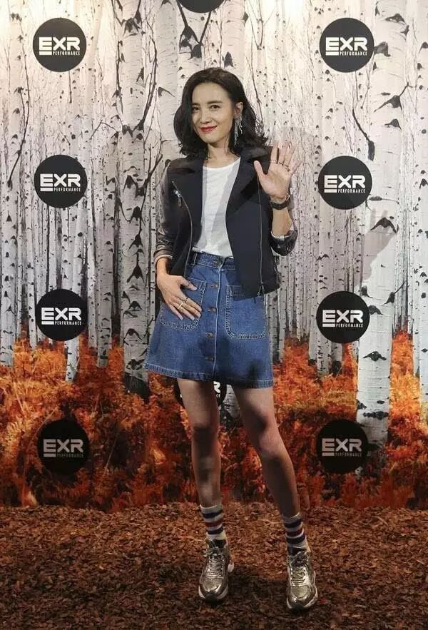 宋佳出席活动的时候,身穿拼接皮夹克配白T恤和排扣牛仔裙,经典的A字版型,棉袜配时髦球鞋更是减龄加倍。