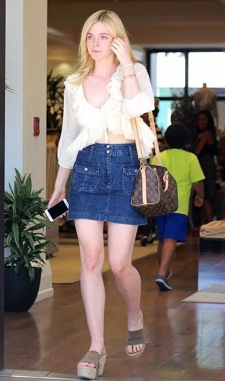 Elle Fanning身穿牛仔半身裙出街,荷叶边深V领,小露性感。