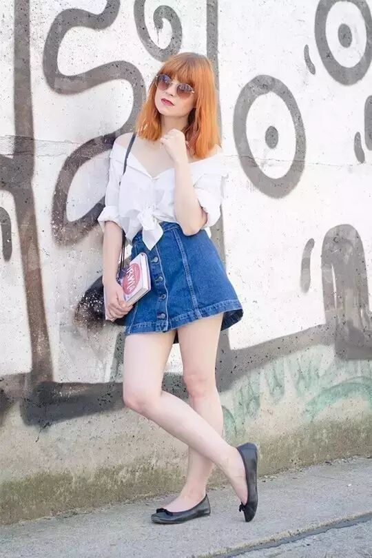 你也可以开掉多个扣子把它变成露肩的款式,再搭配一件牛仔短裙,即使穿平底鞋也可以很出彩。