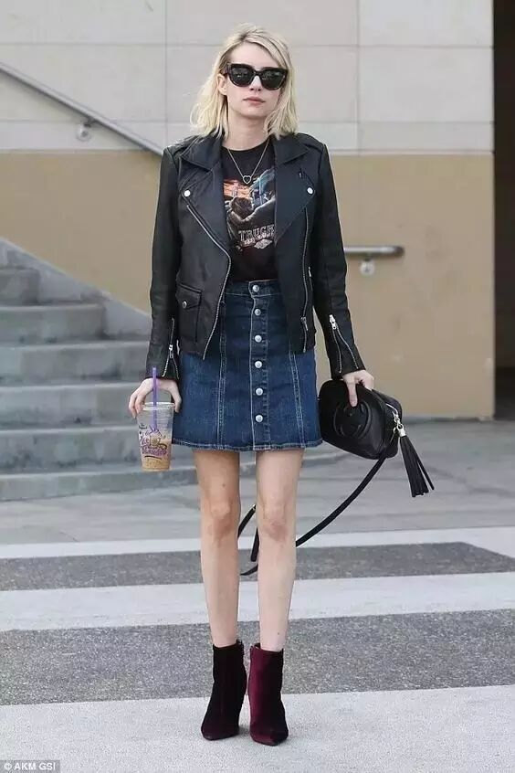 Emma reberts,皮夹克配T恤和单排扣牛仔裙,高腰款短裙配高跟靴子,轻松拉长了全身比例,帅气又时髦。