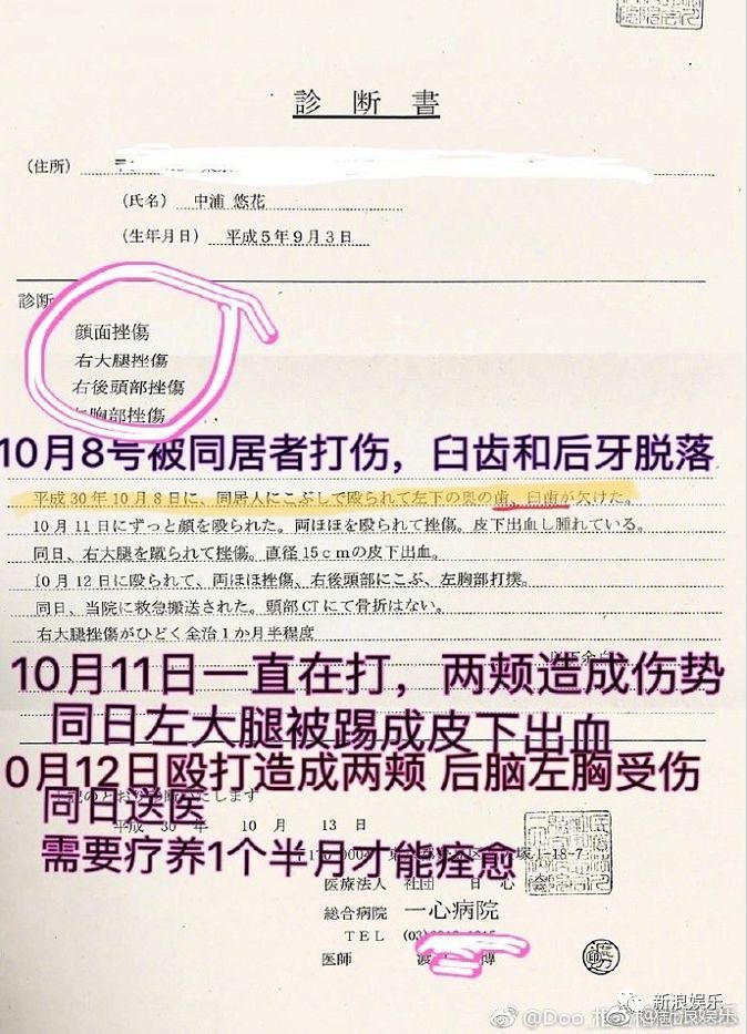 中浦悠花那边是公开了她的医院诊断书。上面显示今年10月8日,她被蒋劲夫打伤,臼齿和后牙脱落。10月11日和12日,也都遭到了蒋劲夫的家暴。