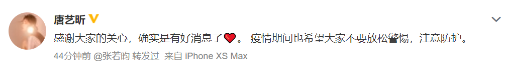 唐艺昕发文宣布怀孕,张若昀随后转发。