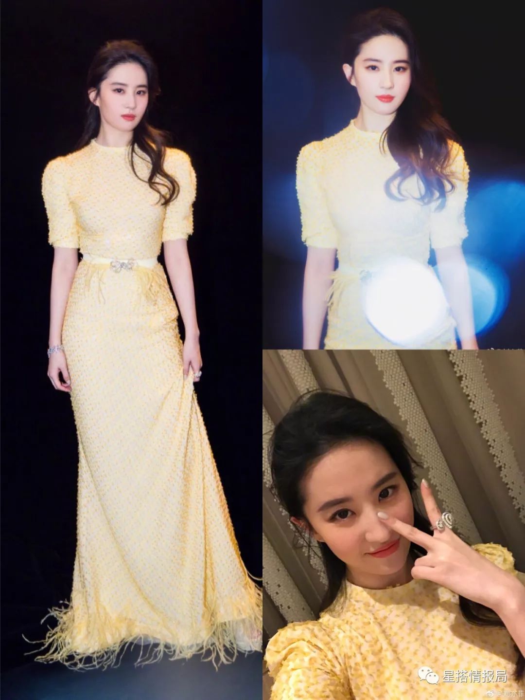 周冬雨虽然是窄肩,但是仍然可以把各种小礼服撑起来,就是因为要么她穿的是肩部有蕾丝装饰,要么是飞袖木耳边,可以延伸肩部的宽度。