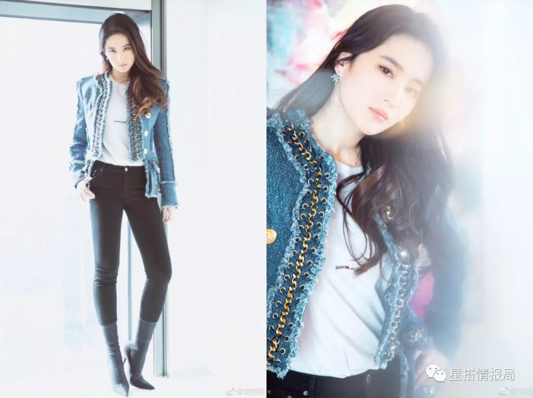 同样有复杂链条装饰的垫肩款牛仔小外套也是可以的~