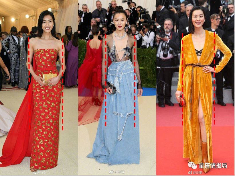我们来看下刘雯穿不同款式礼服的肩部臀部对比。左图跟中间和右图相比的话,明显会显得肩膀宽阔,中间礼服的裙摆是往外扩的,加上有腰身,所以会显得肩部最窄。最右虽然是V领,但是裙摆垂直下来,没有伞裙显肩窄。