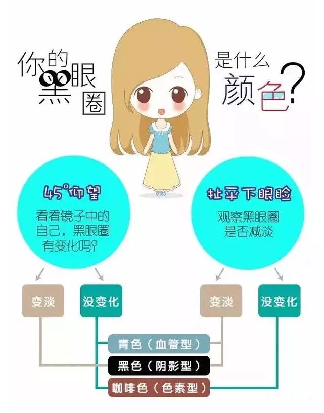 它有三种颜色:咖啡色黑眼圈、青色黑眼圈、黑色黑眼圈。每种类型的黑眼圈大不同,要对症下药才能药到病除!