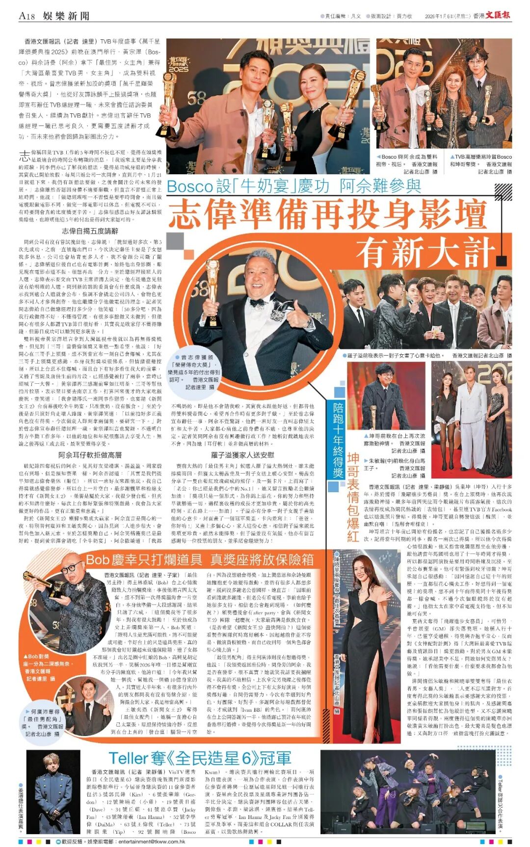 TVB年度盛事《萬千星輝頒獎典禮2025》前晚在澳門舉行,黃宗澤(Bosco)與佘詩曼(阿佘)拿下「最佳男、女主角」兼得「大灣區最喜愛TVB男、女主角」,成為雙料視帝、視后。曾志偉獲頒新加設的獎項「萬千星輝榮譽傳奇大獎」,他從好友譚詠麟手上接過獎項,也隨即宣布辭任TVB總經理一職,未來會擔任諮詢委員會召集人,繼續為TVB獻計。志偉坦言辭任TVB總經理一職已思考良久,更需要五度請辭才成功,而未來他將會回歸為影圈出分力。
