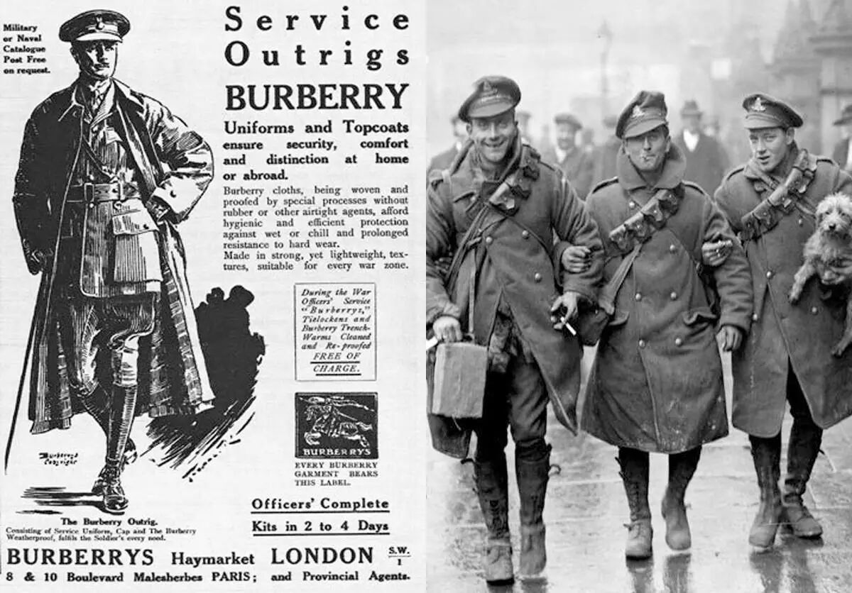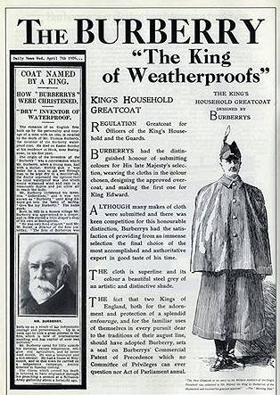 嘎巴甸在1888年获得了专利并授权为当时的英军设计并制造雨衣。1901 年,Burberry 设计出第一款风衣。一战期间,英皇爱德华七世将 Burberry 这款雨衣指定为英国军队的高级军服。