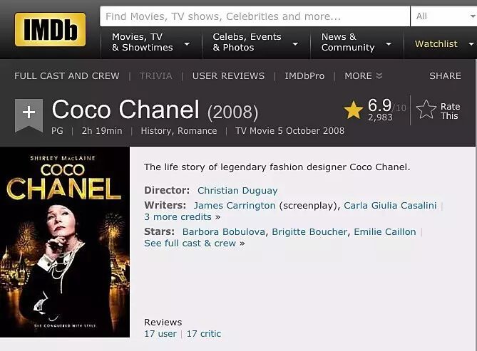 没错,不高,但同样为著名奢侈品品牌创始人的半自传式电影 Coco Chanel ,在 IMDb 上只得了6.9分。。。