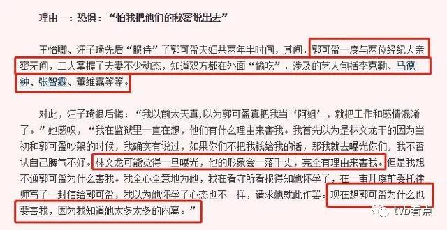 而因林文龙丑闻事件被陷害入狱的汪子琦一年后因勒索案证据不足上诉成功,提前释放,出来以后就迫不及待地联合郭可盈在内地的经纪人王怡卿爆出郭可盈和林文龙的猛料,吃瓜群众才了解到更多。