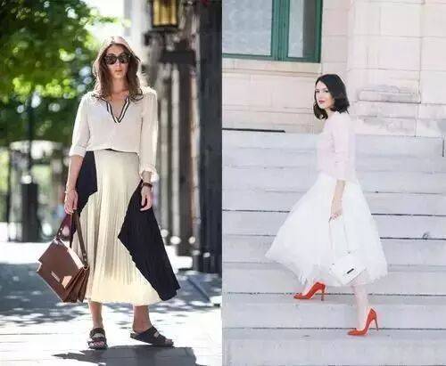1、及脚踝的半身裙+上衣,注意将上衣塞进裙子里面,打造高腰的效果,拉长下半身的视觉效果,露出脚踝的部分十分完美,显瘦又显高!