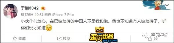而昨天上午于娜发了一个微博让大家匪夷所思,于娜声称在巴被劫持的中国人不是她,这是咋回事呢?小编丈二和尚摸不着头脑,这件事情怎么又跟于娜扯到了一起,难道于娜前往巴基斯坦了?为了让大家放心特发此博?