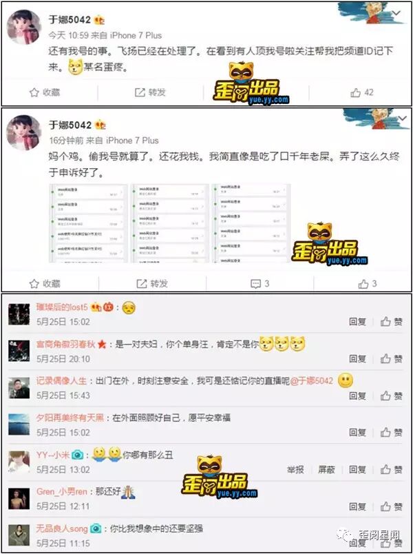 而真相在随后曝光了出来,原来于娜的号被盗了,盗号的人该马甲:“于娜被绑架”,这位盗号的还把于娜号里面的YB给花了,气的于娜大骂盗号的。