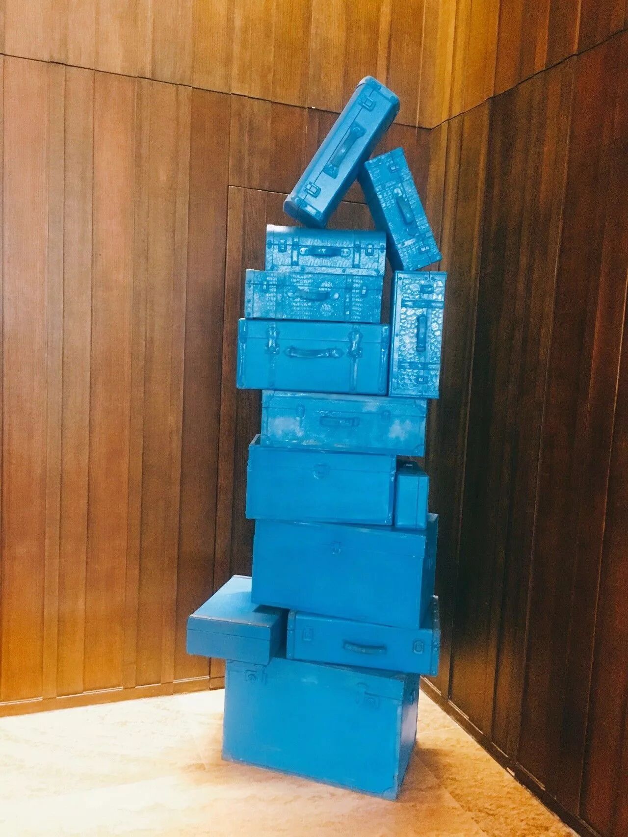 雕塑后面的一组箱子是过去商人出海的人们提的行李箱,象征着远渡重洋