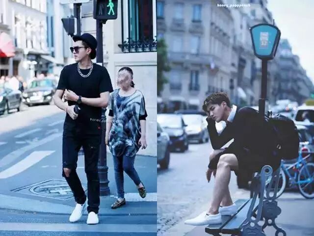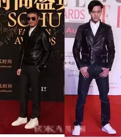 伟霆and耿乐一身黑的皮夹克,配了一双白色的sneaker,这样一来,反倒让人眼前一亮的感觉。感觉皮衣的硬气感都柔和了许多。